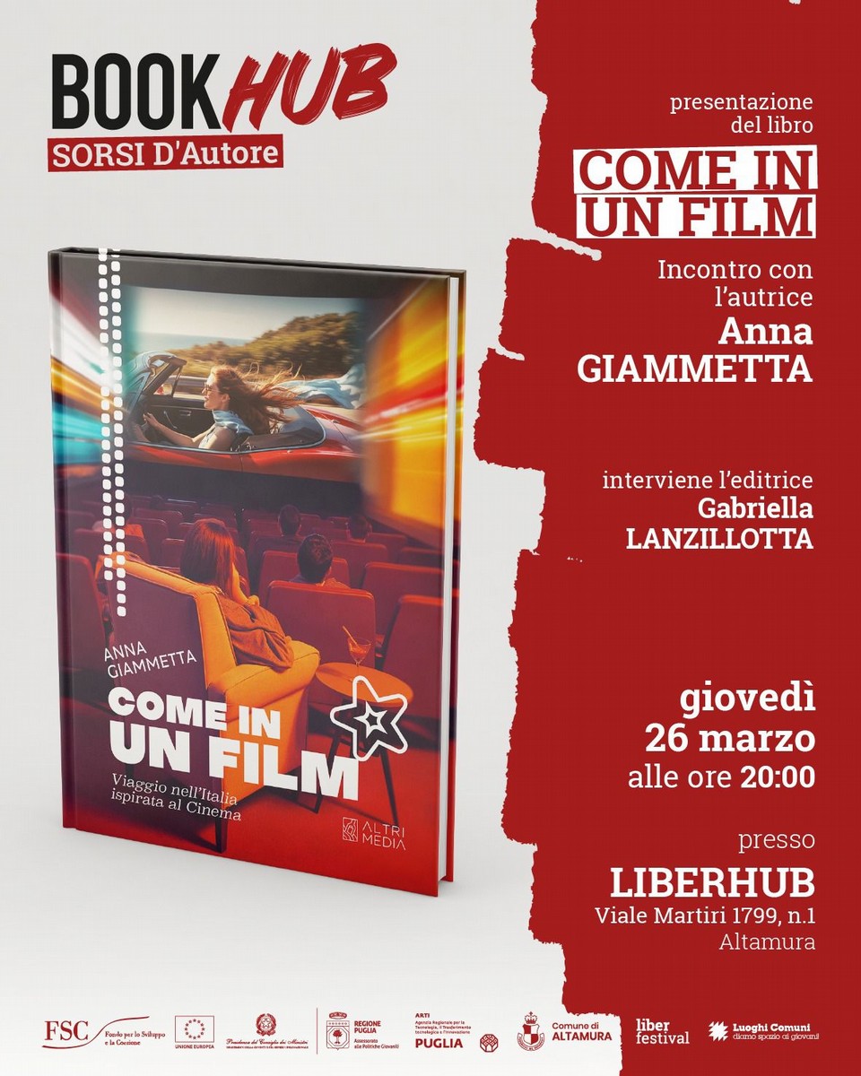 Un viaggio tra cinema e territori, tra emozioni e storie che sembrano uscite dal grande schermo. Giovedì 26 marzo alle ore 20:00, nel LiberHub in viale Martiri 1, si tiene la presentazione del libro "Come in un film – Viaggio nell'Italia ispirata al cinema" Altrimedia Edizioni, della giornalista Anna Giammetta.