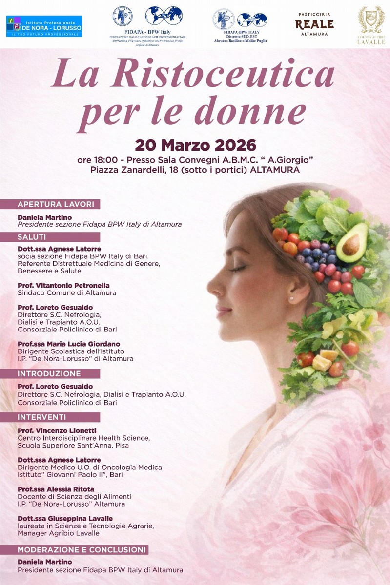 La Fidapa BPW Italy – Sezione di Altamura organizza il convegno sul tema "La Ristoceutica per le donne", in programma venerdì 20 marzo 2026 alle ore 18:00, nella Sala Convegni A.B.M.C. "A. Giorgio" in Piazza Zanardelli, 18 – Altamura.