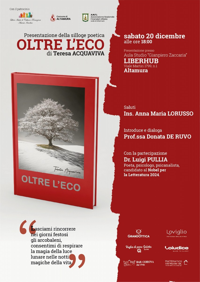 Sabato 20 dicembre, alle ore 18.00, nell'aula studio "Gianpiero Zaccaria" del LiberHub in viale Martiri, viene presentata la silloge poetica "Oltre l'eco" di Teresa Acquaviva. Accesso libero. L'incontro reca i patrocini del Libero istituto di cultura e formazione "Antonio Iervolino", del Comune di Altamura e dell'Anfi - Associazione nazionale finanzieri d'Italia.