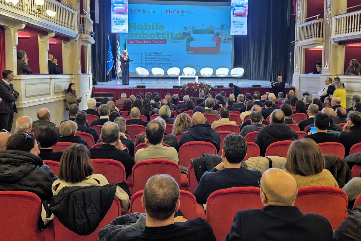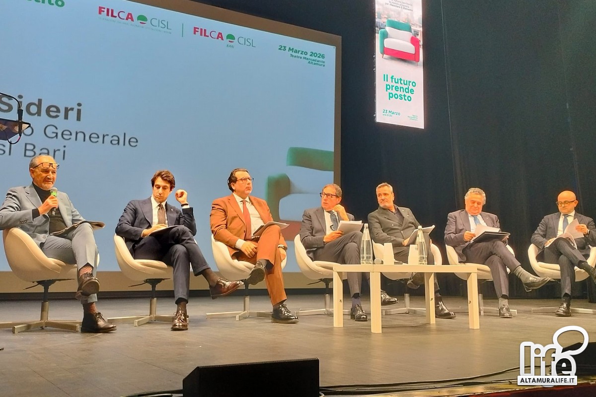Si è svolto ieri nel teatro Mercadante un convegno organizzato dalla Filca Cisl Bari, sul tema "Mobile imbottito: dalla crisi al patto", sul rilancio del settore. Ha partecipato la segretaria nazionale della Cisl Daniela Fumarola. Sono intervenuti Giuseppe Boccuzzi Segretario Generale Cisl Bari; Ottavio De Luca Segretario Generale Filca Cisl Nazionale; Luigi Triggiani Segretario Generale Unioncamere Puglia; Luigi Sideri Segretario Generale Filca Cisl Bari; Leo Caroli, Presidente Comitato SEPAC Regione Puglia; Antonio Castellucci Segretario Generale Cisl Puglia; Antonio Delle Noci Segretario Generale Filca-Cisl Puglia; Donato Caldarulo Presidente Distretto Industriale del Mobile Imbottito di Matera. Hanno partecipato il sindaco di Altamura Vitantonio Petronella e i rappresentanti delle amministrazioni di Gravina in Puglia e Santeramo in Colle.